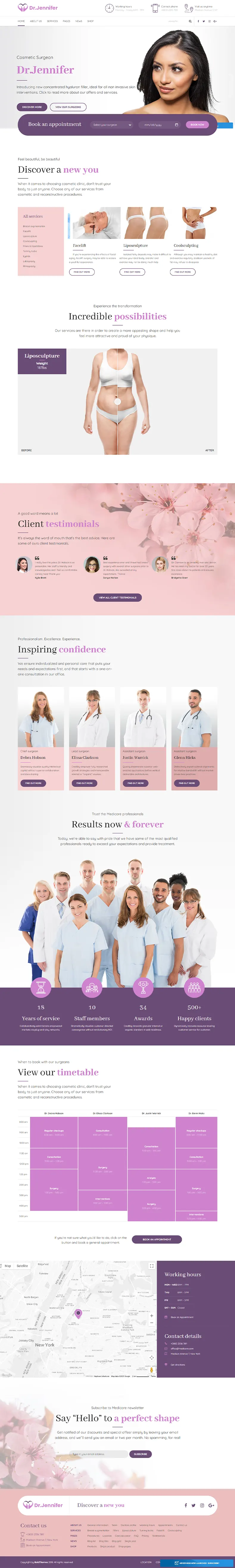 Created for cosmetic surgeons, plastic surgeons and aesthetic clinics, this layout focuses on trust, visual results and credibility. Show procedure details, risks and benefits, before-and-after photos, credentials, media features and patient testimonials in a sophisticated design.